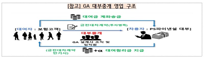 그 결과, GA 대표 및 설계사 등 67명이 가담해 보험계약자 415명이 대부업체인 PS파이낸셜대부에 1113억원의 자금을 대여토록 알선했다.