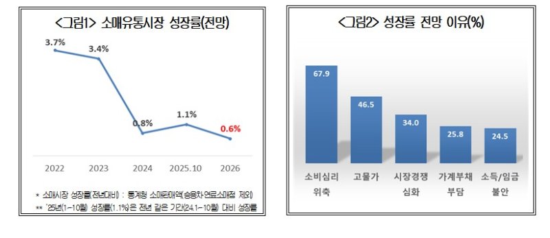 22일 대한상공회의소(대한상의)가 전국 소매유통업체 300곳을 대상으로 실시한 '2026년 유통산업 전망 조사' 결과에 따르면 내년 국내 소매유통시장 성장률은 0.6%로 최근 5년 내 가장 낮은 수준을 기록할 것으로 나타났다.