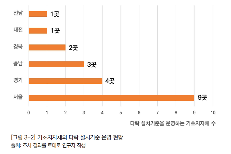 22일 건축공간연구원이 발간한 정책연구보고서에 따르면 전국 17개 광역자치단체 가운데 다락 설치 기준을 별도로 운영 중인 곳은 제주 1곳에 불과했다. 226개 기초자치단체 중에서도 관련 기준을 마련한 곳은 20곳에 그쳤다. 지역별로 보면 서울 내 자치구가 9곳으로 가장 많고, △경기도 내 시 4곳 △충남 내 군 3곳 △경북 내 시 2곳 △대전 내 자치구 1곳 △전남 내 군 1곳 순이다.