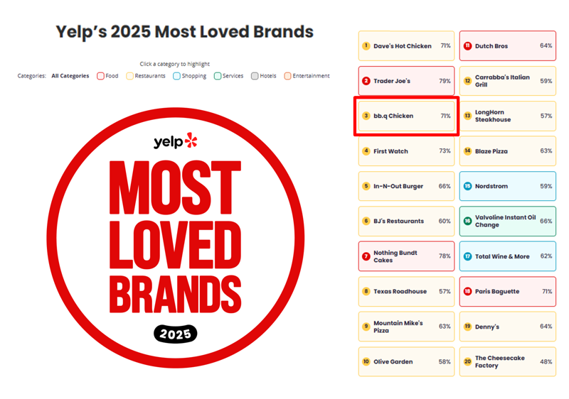 [파이낸셜뉴스] 제너시스BBQ 그룹은 자사 치킨 브랜드 BBQ가 미국 대표 로컬 리뷰·검색 플랫폼 '옐프(Yelp)'가 발표한 '미국에서 가장 사랑받는 브랜드' 순위에서 전체 3위를 기록했다고 22일 밝혔다.