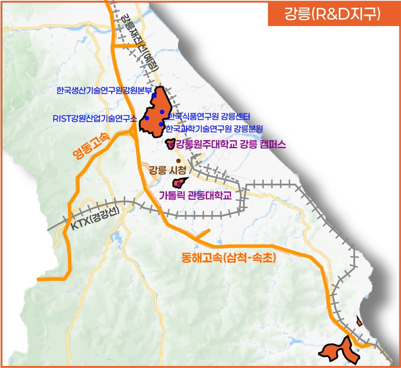 특히 강릉시에는 연구개발특구 지정 요건 중 핵심이 되는 정부출연 연구기관인 KIST강릉분원 천연물연구소, 한국생산기술연구원강원본부 등이 강릉과학산업단지 내 다수 분포하고 있어 이번 강원연구개발특구지정 후 첨단 R&D 허브 역할 수행에 중심에 서게 될 전망이다.