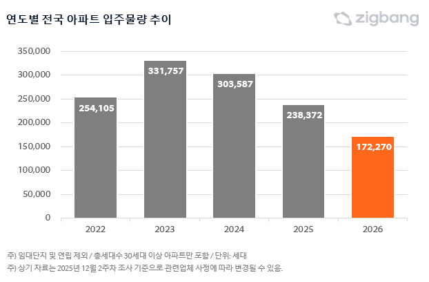 22일 직방에 따르면 2026년 전국 아파트 입주물량은 총 17만 2270가구로 집계됐다. 이는 올해 23만8372가구 보다 28% 감소한 수치다.