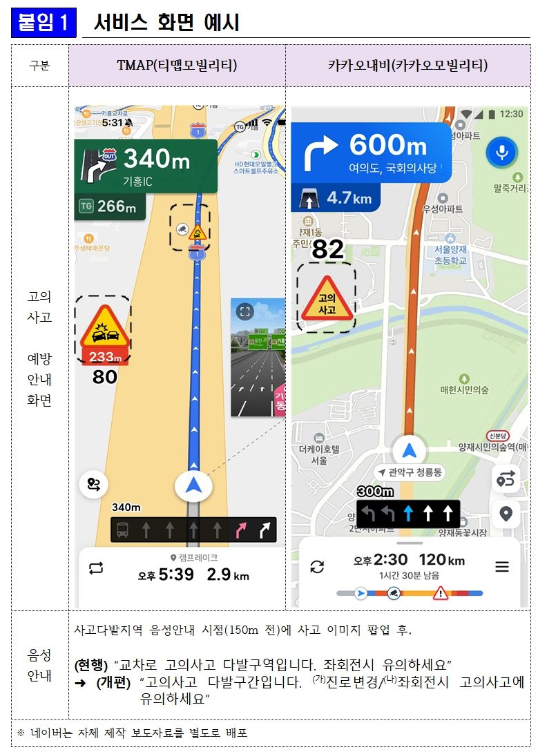 또 기존 티맵과 카카오내비에 더해 네이버지도 길찾기 서비스에서도 고의사고 음성안내가 제공된다. 안내 방식도 강화된다. 기존에는 사고다발 지역 진입 직전 15m에서 안내가 이뤄졌지만, 앞으로는 진입 150m 전부터 음성안내가 시작된다. 아울러 해당 지역에서 빈번하게 발생하는 사고 유형(진로 변경, 좌회전 고의사고 등)을 팝업 형태로 추가 안내해 운전자의 경각심을 높일 계획이다.