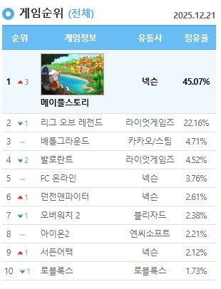 넥슨은 22일 PC방 통계서비스 '더 로그'의 전날 기준 데이터를 공개하며 이같이 밝혔다. 메이플스토리는 지난 21일 PC방 점유율 45.07%를 기록하며 전체 게임 순위 1위에 등극했다.