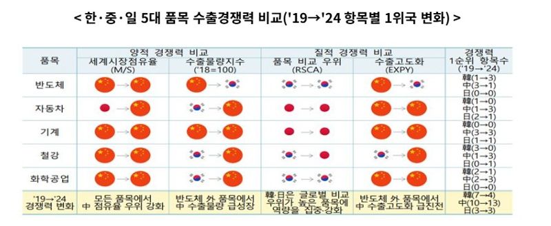 한국무역협회(KITA) 국제무역통상연구원이 23일 발표한 '5대 주력품목 한·중·일 수출경쟁력 비교' 보고서에 따르면, 2019년부터 2024년까지 한국은 반도체를 중심으로 경쟁력을 유지·강화한 반면, 중국은 반도체를 제외한 전통 제조업 전반에서 경쟁력을 크게 끌어올렸다.