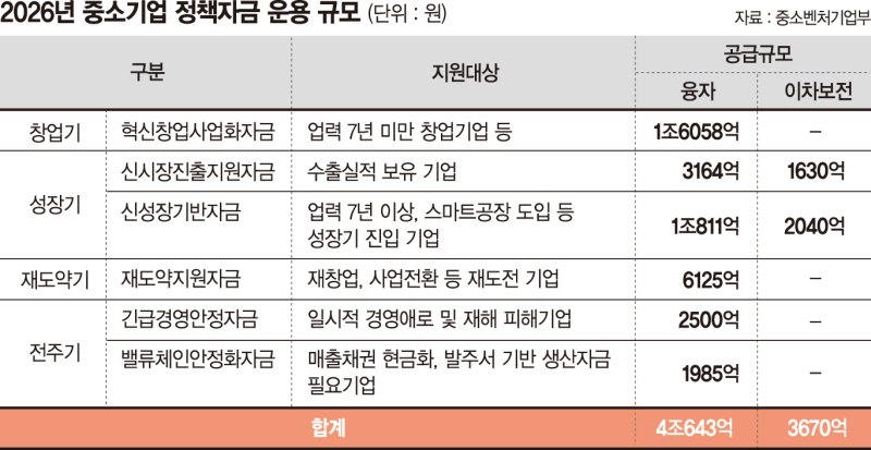 22일 중소벤처기업부가 발표한 '2026년 중소기업 정책자금 운용계획'에 따르면 새해 중소기업 정책자금은 융자 4조643억원, 민간 금융기관 대출금 이차보전 3670억원 등 총 4조4313억원 규모로 공급된다.