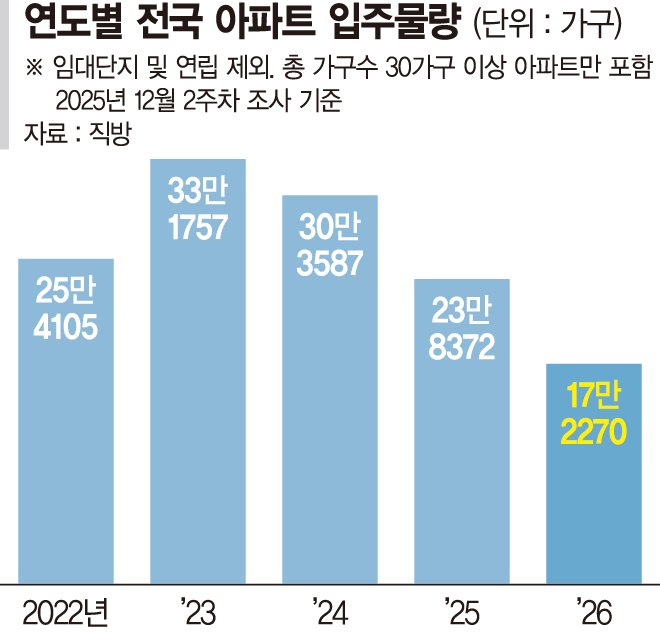 22일 직방에 따르면 2026년 전국 아파트 입주물량은 총 17만2270가구로 집계됐다. 이는 올해 23만8372가구 보다 28% 감소한 수치다.