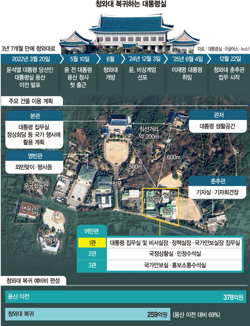 대통령실 참모들의 업무 공간은 지난주부터 순차적으로 용산에서 청와대로 이전되고 있다. 이 대통령은 이번 주까지는 용산에서 수석보좌관 회의 등을 주재한 뒤, 다음 주부터 청와대로 자리를 옮길 예정이다. 대통령실은 이 대통령의 청와대 첫 출근 시점이 정해지면 그에 맞춰 국민에게 청와대 복귀를 보고하는 행사도 준비 중인 것으로 전해졌다. 다만 관저 공사가 아직 진행 중이어서 이 대통령은 청와대 복귀 이후에도 불가피하게 당분간 한남동에 위치한 지금의 관저에서 출퇴근한다. 관저 공사는 내년 상반기 중 마무리될 전망이다.
