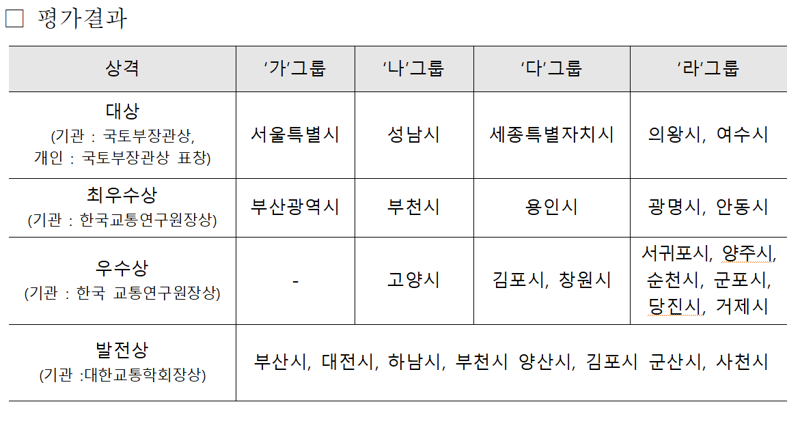 이번 평가는 인구 10만명 이상 71개 지자체를 대상으로 인구수와 도시 특성에 따라 4개 그룹으로 분류해 실시됐다. 전문가 등으로 구성된 평가위원단이 총 26개 지표를 기준으로 평가했다.