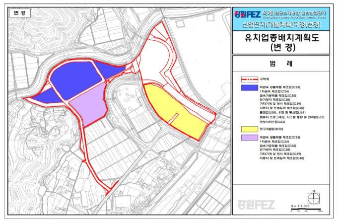 강원경제자유구역청은 다양한 첨단산업의 입주 촉진을 위해 업종 특례지구로 지정된 구역에 대해 경제자유구역 개발계획을 변경, 유치 업종을 기존 7개에서 11개로 확대했다.