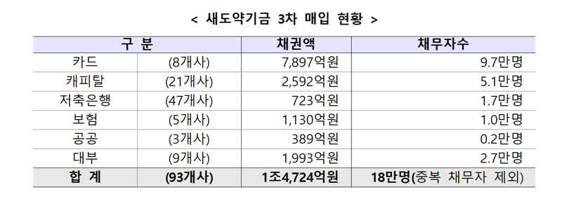 새도약기금은 7년 이상 연체, 5000만원 이하의 개인(개인사업자 포함) 무담보채권을 카드사, 캐피탈사, 저축은행, 손해보험사, 대부회사 등으로부터 매입했다.