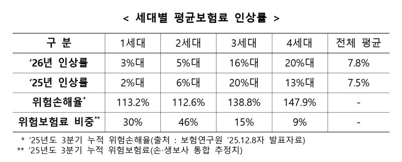 세대별로 보면 인상률 격차는 뚜렷하다. 가장 최근에 출시된 4세대 실손의료보험의 평균 인상률은 20%대로 가장 높았고, 3세대 실손보험도 16%대 인상이 예정됐다. 반면 2세대 실손보험은 5%대, 1세대 실손보험은 3%대 인상에 그칠 것으로 나타났다.