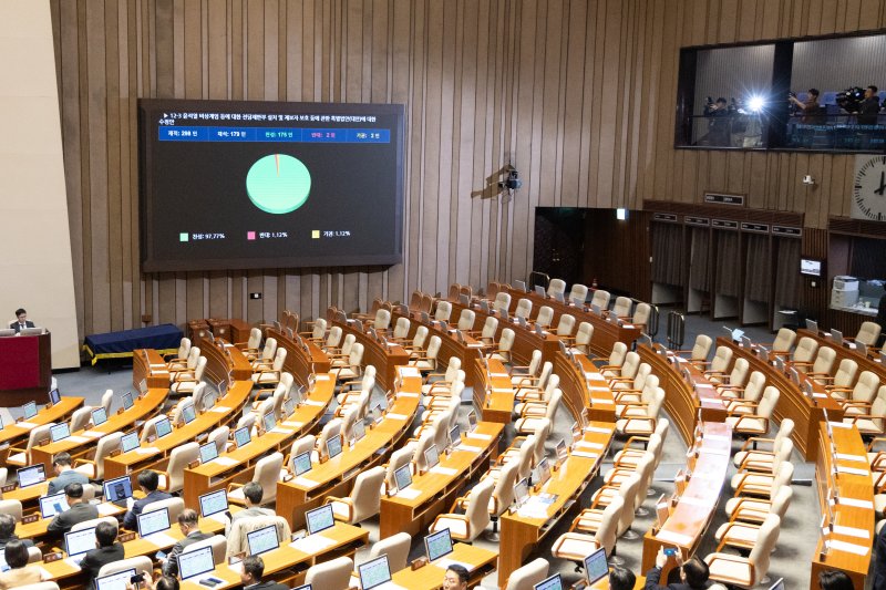 국회는 23일 본회의를 열고 '내란·외환·반란 범죄 등의 형사절차에 관한 특례법안'을 재석 179명 중 찬성 175명, 반대 2명(개혁신당 천하람·이주영), 기권 2명(민주당 박주민·무소속 최혁진)으로 통과시켰다.