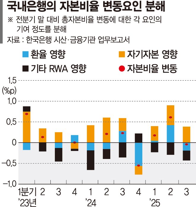 23일 한은이 발표한 '2025년 하반기 금융안정보고서'에 따르면 지난 3·4분기 환율 요인이 국내은행 자본비율을 전 분기 말 대비 0.2%p 하락시킨 것으로 나타났다. 한은 관계자는 "환율 상승 폭이 컸던 지난해 4·4분기 중에도 은행의 자본비율이 큰 폭으로 내린 바 있는데, 환율 기여도가 상당한 것으로 추정됐다"고 설명했다.