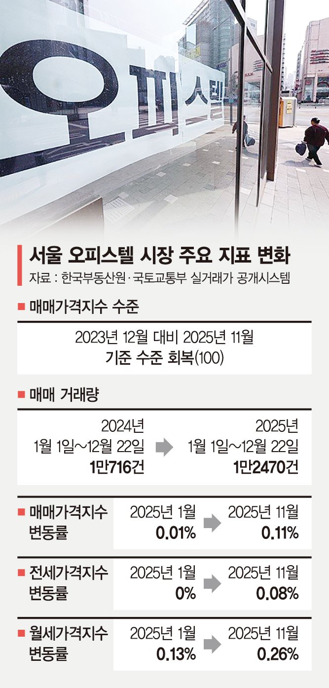거래량 회복도 뚜렷하다. 국토교통부 실거래가 공개시스템에 따르면 서울 오피스텔 매매 거래량은 올해 1월 1일부터 12월 22일까지 누적 1만2470건으로, 전년 동기(1만716건) 대비 16.4% 증가했다. 거래 절벽이 이어졌던 지난해와 비교하면 실거래 시장에서 매수 움직임이 확연히 살아난 모습이다.