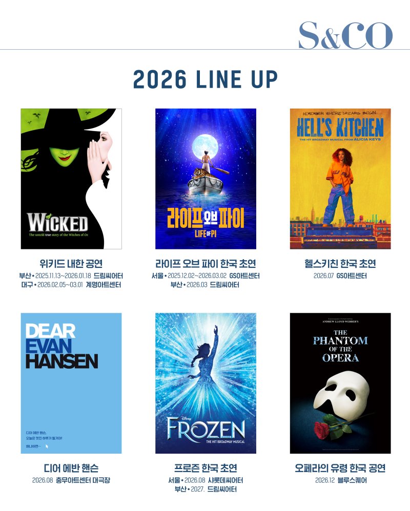 한편 에스앤코는 그간 ‘캣츠’, ‘라이온 킹’, ‘알라딘’, ‘하데스타운’ 등 전 세계적으로 사랑받는 작품들을 국내는 물론 아시아 시장에 선보여 왔다. 각 작품의 세부 일정과 캐스팅 등 자세한 정보는 추후 공개될 예정이다.