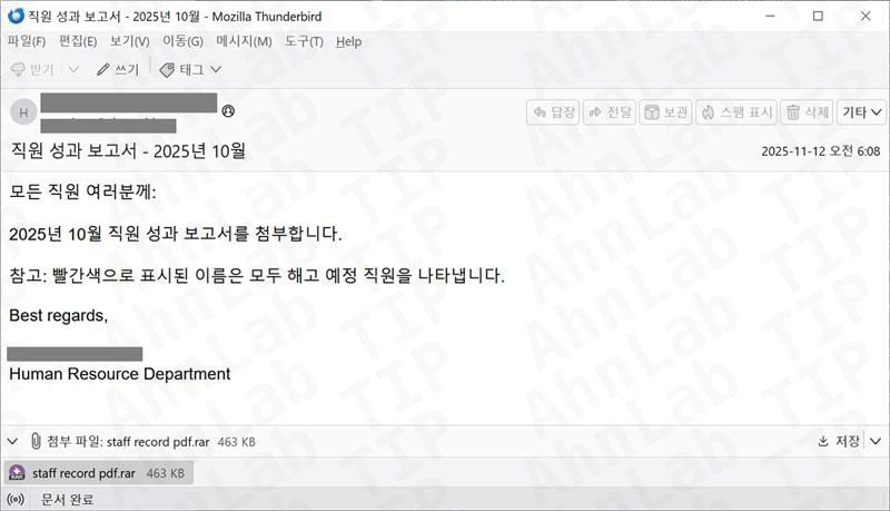 24일 안랩이 공개한 사례에서 공격자는 기업 인사팀을 사칭해 '직원 성과 보고서'라는 제목의 메일을 발송했다. 이번 피싱 공격은 인사 평가 관련 안내 메일이 잦아지는 연말연시를 노려 임직원의 경계심이 낮아진 틈을 파고든 것이 특징이다. 공격자는 메일 본문에 파일을 첨부한 뒤 파일 내 '빨간색으로 표시된 이름은 모두 해고 예정 직원을 나타낸다'라는 문구를 작성해 사용자들이 이를 열어보도록 유도했다.