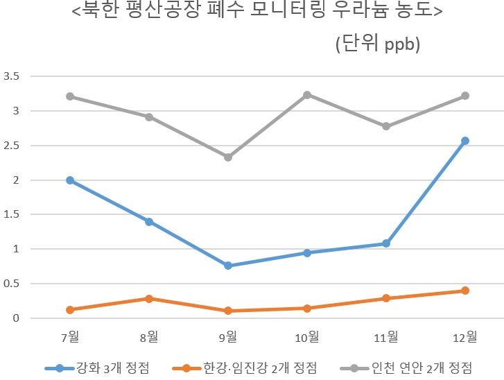 강화 지역 3개 정점과 한강·임진강 하구 2개 정점 및 인천 연안 2개 정점의 우라늄 농도는 평상시 수준으로 모두 확인됐다. 7개 정점에서 중금속 5종 농도는 환경기준 및 해양환경기준 미만이거나 불검출됐다. 통일부 관계자는 "앞으로도 분기별로 모니터링을 지속하며 국민 안전을 지키기 위해 노력할 예정"이라고 전했다. 북한 평산 우라늄공장 폐수에 대한 정기 모니터링은 원자력안전위원회·해양수산부·환경부 등 관계부처가 합동으로 실태조사를 진행중이다.