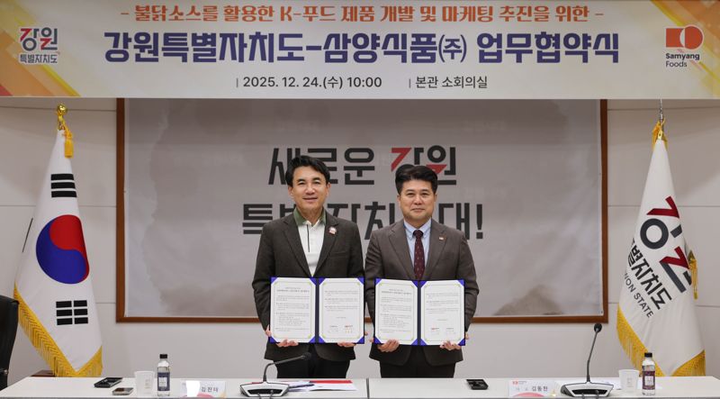 【파이낸셜뉴스 춘천=김기섭 기자】김진태 강원도지사와 김동찬 삼양식품 대표가 24일 도청 본관 회의실에서 도내 식품 중소기업과 불닭소스를 활용한 협업제품 개발을 위한 업무협약을 맺었다.