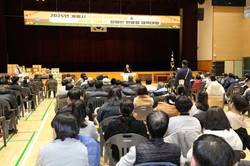 (계룡=뉴스1) 박찬수 기자 = 충남 계룡시는 23일 계룡시민체육관에서 장애인 체육 종목단체 선수, 임원 등 250여 명이 참석한 가운데 ‘2025 장애인 체육인의 날 및 한마음 체육대회’를 개최했다.
