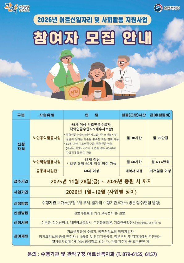 모집은 충원 시까지 진행된다. 신청을 원하는 어르신은 관악구청 홈페이지에 게시된 신청 서류를 지참해 대한노인회 관악구지회 등 11개 수행기관을 방문하면 된다.