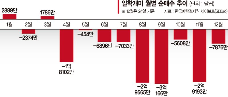 하지만 막상 금리가 인상됐지만 시장 충격은 없었다. BOJ가 기준금리 인상을 발표한 건 지난 19일 오후로 일본 증시 거래가 활성화된 시간이었다. 그럼에도 같은날 일본 증시에서 일학개미의 순매도금액은 240만달러에 그쳤다. 올해 일학개미가 하루 평균 518만달러를 순매도했던 것과 비교해 적은 수준이다. 이후 일학개미는 △22일 1025만달러 △23일 604만달러 △24일 406만달러를 순매도해 매도공세가 꺾이는 양상이다.