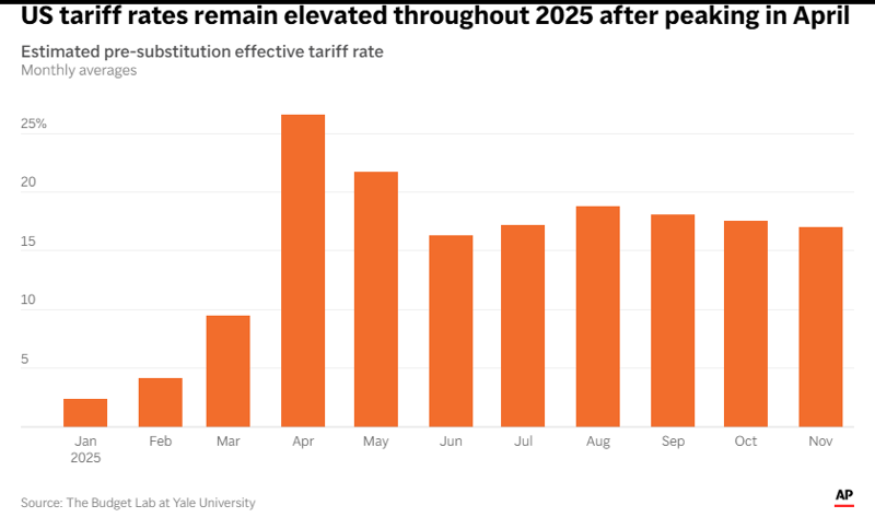 지난 1년간 트럼프 관세 정책의 실질적인 효과와 한계를 가장 명확하게 보여주는 것은 정치적 수사가 아니라 숫자다라고 AP통신은 26일(현지시간) 보도했다. 실효 관세율, 관세 수입과 무역적자, 주요 교역국과의 수입 변화, 그리고 증시 변동성. 이 네 가지 차트는 트럼프 관세정책이 무엇을 바꾸었고, 무엇을 바꾸지 못했는지를 동시에 드러낸다.