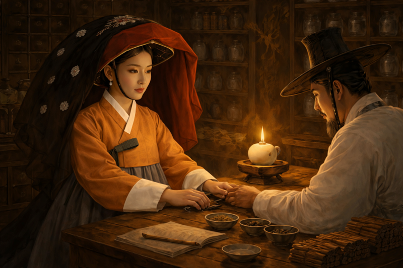 부인은 장옷까지 걸치고 부리나케 발걸음을 옮겼다. 부인이 도착한 곳은 다름 아닌 약방이었다.