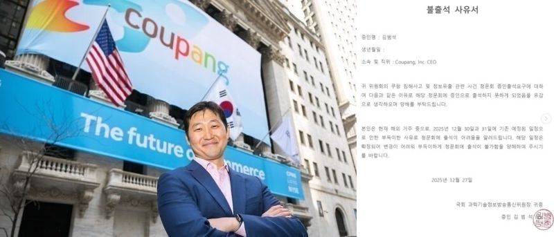 그는 "개인정보 사고 발생 전인 2025년 5월 말에 쿠팡 대표직을 사임했고 그 후 현재까지 미국에서 거주하며 근무하고 있다"며 "대표이사를 사임한 지 이미 7개월이 경과한 상황에서 회사의 입장을 대표해 증언할 위치에 있지 않다고 사료된다"고 했다.