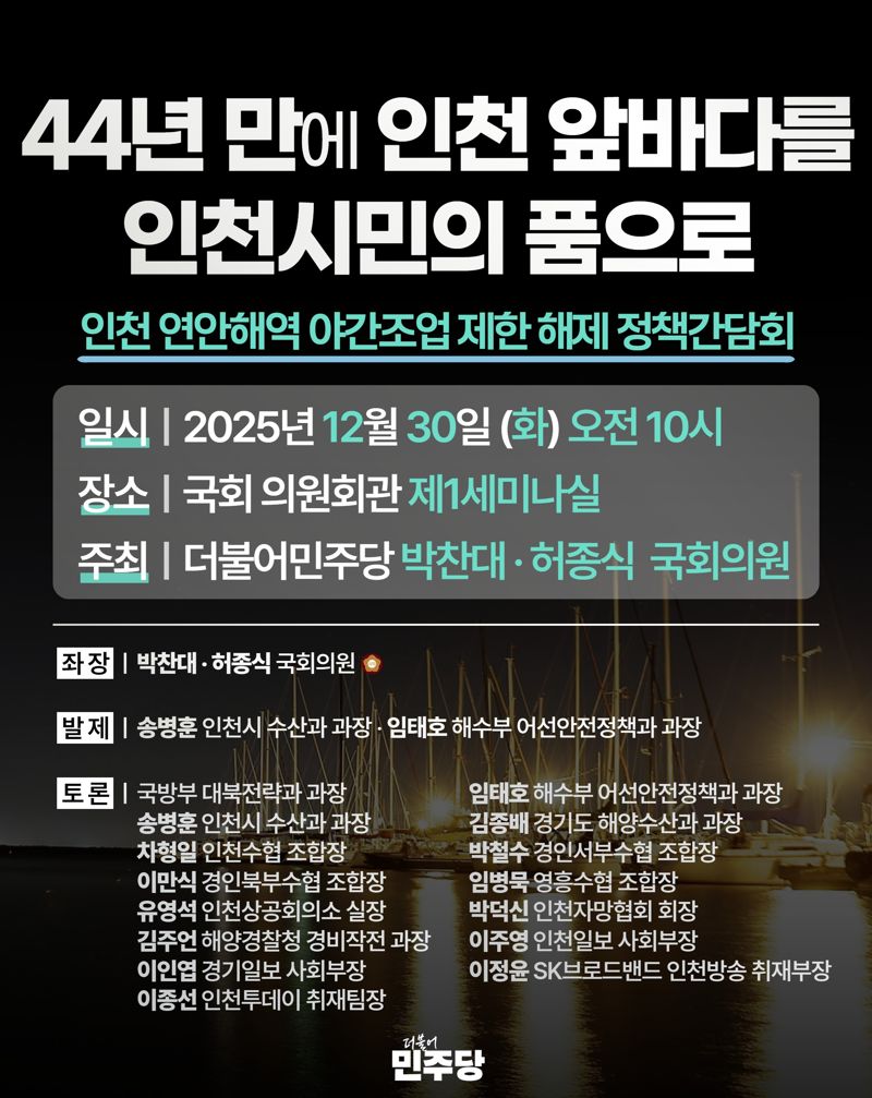 박찬대·허종식 국회의원은 오는 30일 국회의원회관 제1세미나실에서 ‘인천 연안해역 야간조업 제한 해제 정책간담회’를 개최한다고 28일 밝혔다.