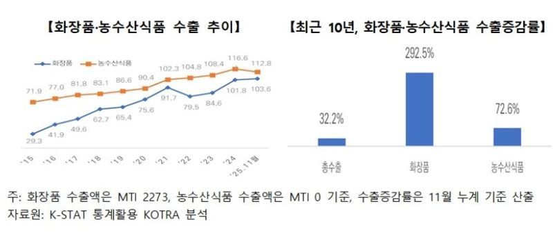 화장품의 경우 1억 달러 이상 수출국이 10년 전 4개국에서 올해 19개국으로 늘었고, 농수산식품도 같은 기준에서 13개국에서 17개국으로 확대돼 시장 다변화도 이뤄지고 있다.
