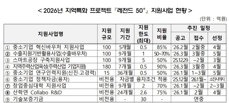 중소벤처기업부는 17개 광역자치단체와 함께 추진하는 '2026년도 지역특화 프로젝트 레전드 50+ 지원사업' 통합공고를 실시한다고 28일 밝혔다.