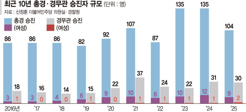 28일 국회 행정안전위원회 소속 신정훈 더불어민주당 의원실이 경찰청으로부터 제출받은 '최근 10년 총경 및 경무관 승진자 규모'에 따르면, 2016년부터 올해까지 총경 승진자 1000명 가운데 여성은 74명(7.4%)에 불과했다. 또 같은 기간 경무관 승진자 229명 중 여성은 8명(3.5%)에 그쳤다.