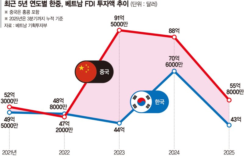 업계에서는 중국 기업과의 처우 경쟁이 장기화될 경우 베트남 진출의 핵심 명분이었던 비용 경쟁력을 잃어버릴 수 있다는 지적도 나온다. 현지 진출 중견기업 관계자는 "인건비가 빠르게 올라가면 생산 거점으로서 베트남의 전략적 의미를 재점검 해야 하는 시점이 올 수 있다"고 말했다.