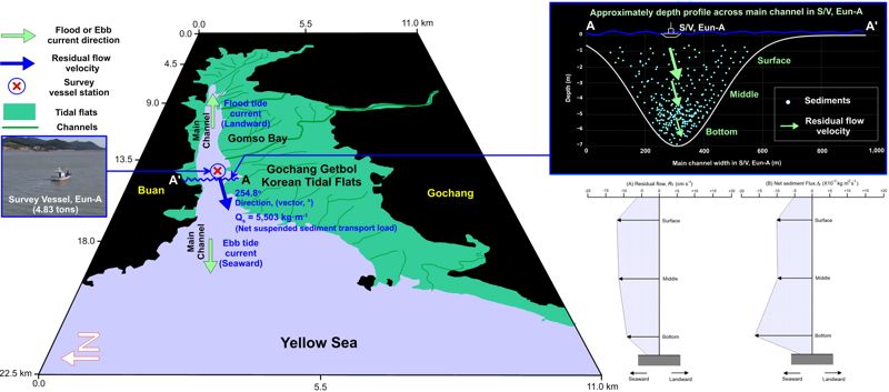 이에 연구팀은 곰소만 갯벌 입구 주 수로에서 염분·수온·수심을 측정하는 ‘CTD’, 유향·유속을 측정하는 ‘RCM’, 조위계, 자동 계측장비와 수심별 채수 기법을 결합한 관측 시스템을 구축했다. 이후 13시간 동안 갯벌에서의 탁도와 부유물질 농도를 연속 관측했다.