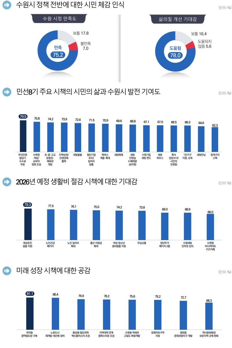 격자형 광역철도망구축, 노후도시 재개발·재건축 정비, 환상형 첨단과학 혁신클러스터 조성 등 수원의 미래를 만들어가는 정책에 대한 공감도는 80% 내외였다.