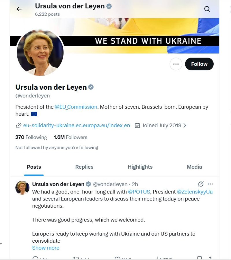 폰데어라이엔 집행위원장은 이날 사회관계망서비스 엑스(X)에 "우리는 트럼프 대통령과 젤렌스키 대통령, 그리고 여러 유럽 정상들과 한시간 동안 전화 통화를 하며 오늘 평화 협상 회담에 대해 논의했다"며 "좋은 진전이 있었고 우리는 환영했다"고 적었다.