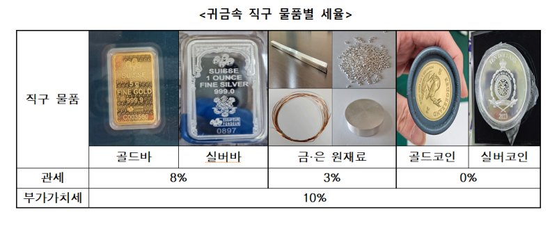 하지만 해외 가격이 국내보다 저렴하다는 이유로 금·은 제품을 덜컥 구매할 경우 예상치 못한 낭패를 볼 수 있다. 흔히 투자용으로 구매하는 골드바·실버바는 금·은 세공품으로 분류되어 8%의 관세와 10%의 부가가치세가 부과되므로, 이러한 세금이 사실상 국내에서 거래되는 물품의 프리미엄보다 더 클 수 있기 때문이다.