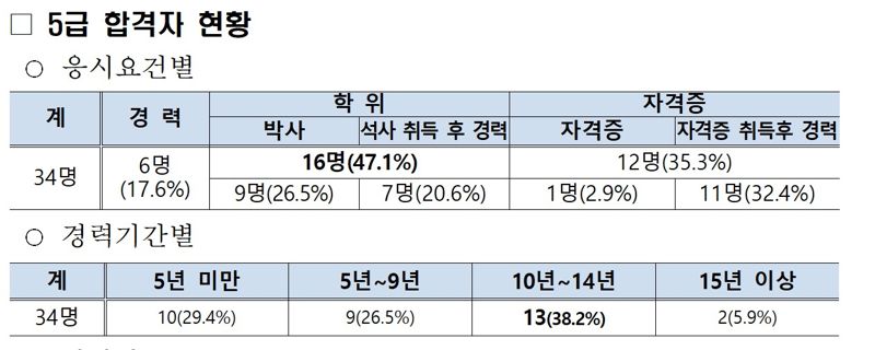 합격자의 평균 경력은 5급 8.7년, 7급 5.8년으로 집계됐다.
