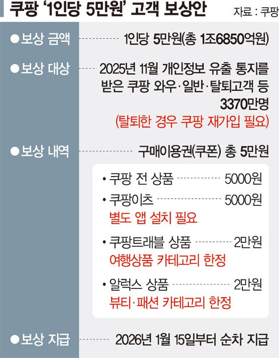 29일 쿠팡이 발표한 1조6850억원 규모의 고객유출사고 보상안을 보면 1인당 5만원의 쿠팡 구매 이용권을 지급하는 것이 핵심이다. 와우회원과 일반회원뿐 아니라 개인정보 유출 통지를 받은 탈퇴 고객도 지급 대상에 포함됐다.