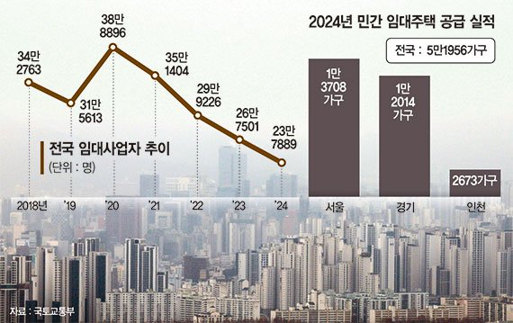 임대사업자 감소세도 가파르다. 전국 전체 임대사업자는 2020년 약 39만명에서 2024년에는 24만명으로 15만명가량 감소했다. 줄어든 사업자 대부분은 민간 임대주택 사업자다. 업계 관계자는 "민간 임대주택 공급을 늘려야 한다는 것은 업계와 전문가들이 계속 요구해 온 내용"이라며 "하지만 결과만 놓고 보면 오히려 역주행하는 모습이 나타나고 있다"고 우려했다.