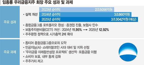 임 회장은 두 번째 임기에서 생산적·포용금융을 실천하는 동시에 안정적인 실적 개선을 이어가야 하는 과제를 안게 됐다. 우리금융 임추위는 향후 과제로 △톱티어 종합금융그룹으로의 도약 △인공지능(AI)·스테이블코인 시대 대비 및 지위 선점 △기업금융 및 계열사를 통한 기업가치 제고를 언급했다.