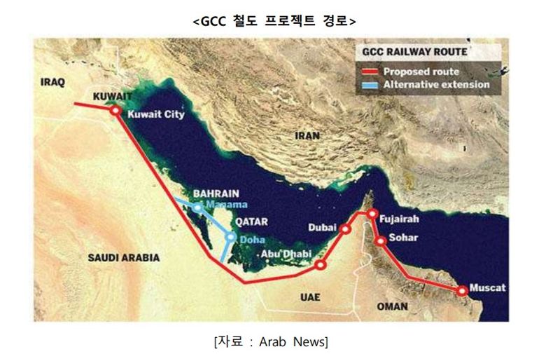GCC 국가들은 2008년 GCC 공동시장 출범을 기점으로 역내 교류 활성화를 위해 GCC 철도 프로젝트를 추진했다. 기존 항만중심 물류를 철도, 공항과 연계된 육해공 복합물류 체계로 발전시킨다는 계획이다.