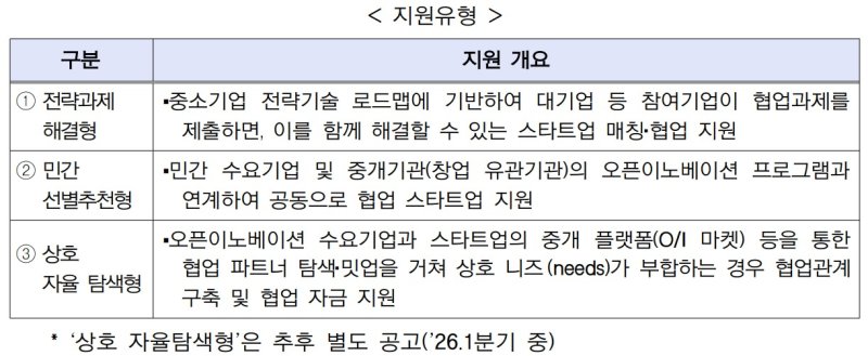30일 중소벤처기업부는 이런 내용의 '2026년 민관협력 오픈이노베이션 지원사업' 공고를 내고 스타트업과의 개방형 혁신 수요가 있는 기업, 공공기관 등을 내달 23일까지 모집한다고 밝혔다.