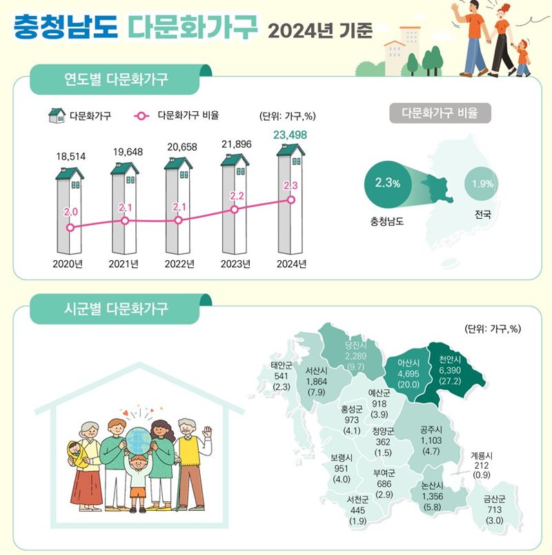 30일 충남도가 발표한 ‘2025 다문화·외국인가구통계’에 따르면 지난해 기준 다문화가구는 2만 3498가구로 도 전체 100만 7652가구의 2.33%, 외국인가구는 4만 1692가구로 4.1%를 차지하고 있다.