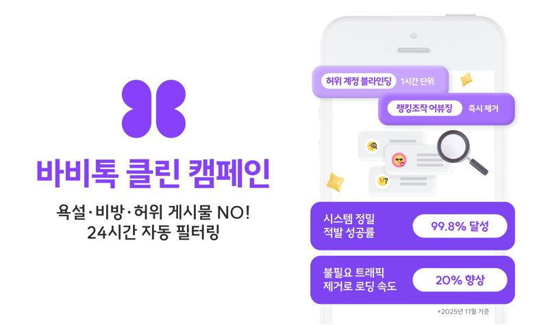30일 업계에 따르면 바비톡은 2020년부터 플랫폼 내 과도한 홍보나 비방 등의 비정상 활동을 지속적으로 모니터링하며 정보의 신뢰도를 높이기 위한 ‘클린캠페인’을 꾸준히 운영해 왔다. 최근 사용자 보호와 정보 투명성에 대한 요구가 높아짐에 따라 이를 한층 정교하게 발전시켰다. 이번 고도화는 이용자가 믿고 탐색할 수 있는 정보 환경을 강화하고, 보다 정확한 의사결정을 돕기 위한 장기적 기술 투자 방향의 연장선으로, AI·서버·네트워크를 아우르는 3중 방어 체계로 확장 적용됐다.
