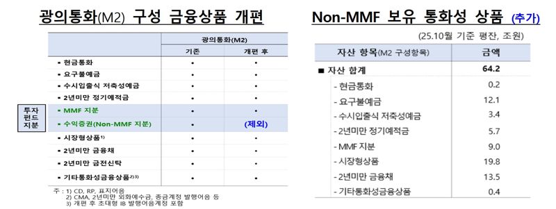 이 같은 기준 변경으로 올해 10월 기준 신(新) 기준 M2 잔액은 4056조8000억원으로 집계됐다. 기존 기준(4466조3000억원)보다 409조5000억원 줄었다. 수익증권 제외에 따른 감소 효과가 497조원에 달했지만, 초대형 IB 발행어음 편입과 통계 편제 방식 개선으로 일부 증가 요인도 발생했다.