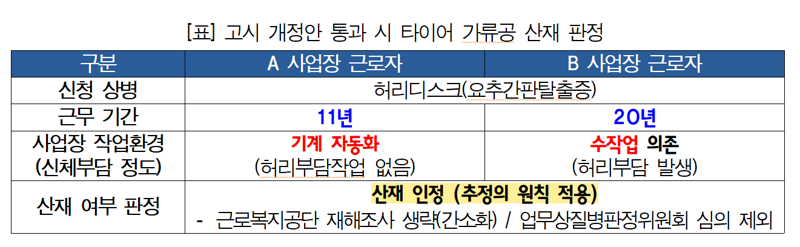 그러면서 "통계학적으로 최소한 30개 이상의 사례값 확보가 상식임에도 7건(타이어 가류공), 10건(조선업 전장공) 신청에 그친 직종을 개정안에 포함시켜 대표성·적합성을 확보한 인정기준이라 할 수 없다"며 "만성질환인 근골격계질병 특성을 고려한다면, 최소 10~20년 간의 분석을 통한 장기 추이 분석과 해당 업종·직종의 작업환경 개선 정도 등의 검토가 필요하다"고 강조했다.