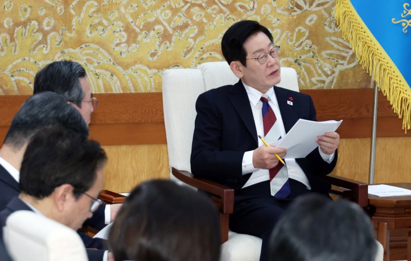 이재명 대통령이 지난 29일 청와대 본관에서 김용범 정책실장 등 참모진과 차담회를 하고 있다. 청와대통신사진기자단