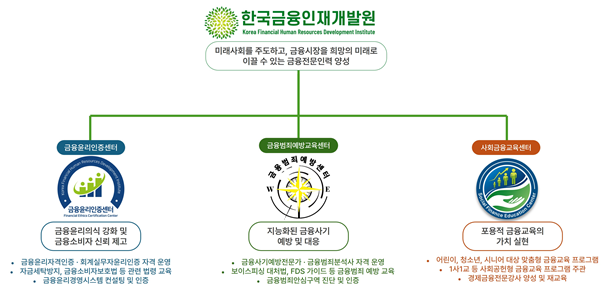 30일 한국금융인재개발원에 따르면 이번 개편의 핵심은 기존에 운영되던 '한국금융인재개발원' 사이트와 '금융윤리인증센터' 체제에서 전문 분야별로 고도화된 △금융윤리인증센터 △금융범죄예방교육센터 △사회금융교육센터 중심의 체계적 금융교육 플랫폼으로 거듭난 점이다.